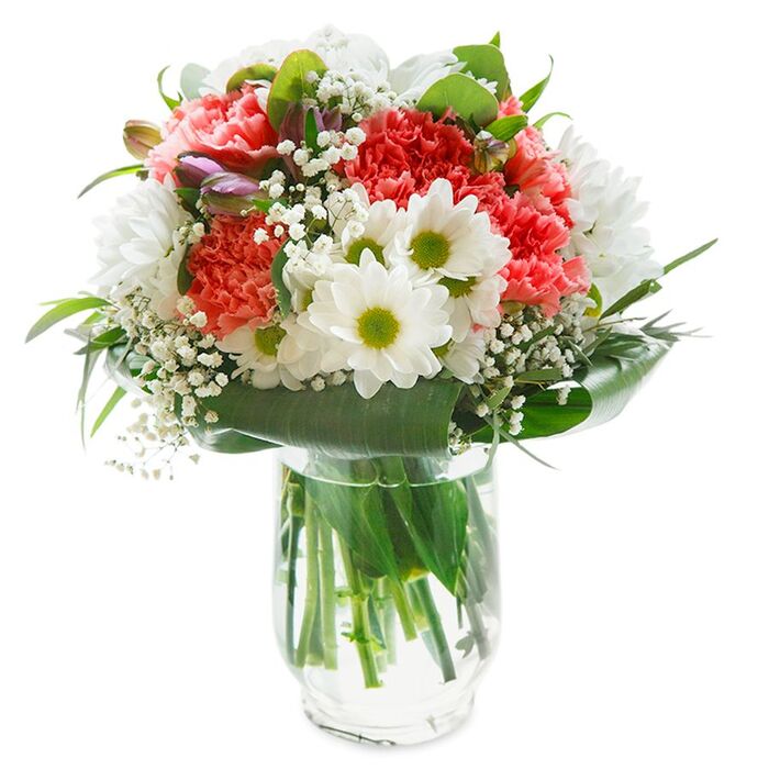 Celebrate the finer things with this stunning seasonal flower arrangement, a true masterpiece of nature. Featuring the pristine beauty of white chrysanthemums, the airy presence of gypsophila, and the soft allure of light pink carnations, accented with vibrant aspidistra leaves, every element is hand-selected and curated for its impeccable quality. Enjoy the luxury of a bouquet that promises a 5-day freshness guarantee for an enduring display of nature’s beauty.